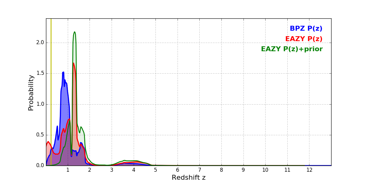 In P(z) plots: Yellow lines mark the cluster redshift z = 0.228,