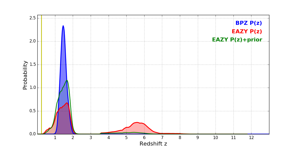 In P(z) plots: Yellow lines mark the cluster redshift z = 0.228,