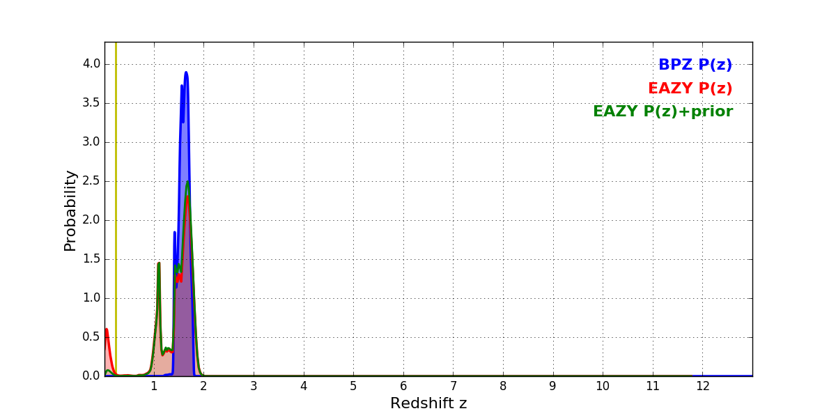 In P(z) plots: Yellow lines mark the cluster redshift z = 0.228,