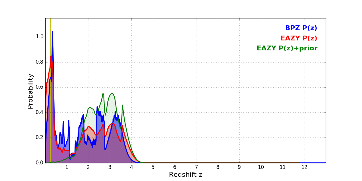 In P(z) plots: Yellow lines mark the cluster redshift z = 0.228,