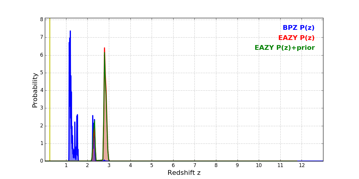 In P(z) plots: Yellow lines mark the cluster redshift z = 0.228,