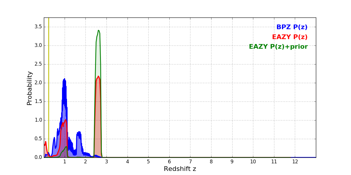 In P(z) plots: Yellow lines mark the cluster redshift z = 0.228,