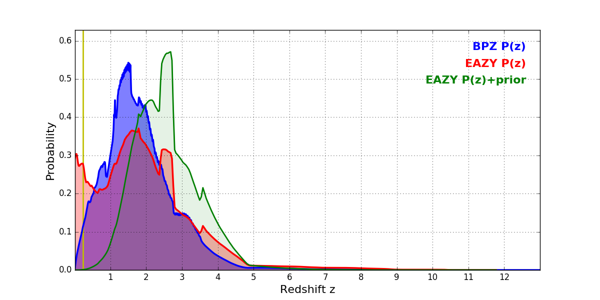 In P(z) plots: Yellow lines mark the cluster redshift z = 0.228,