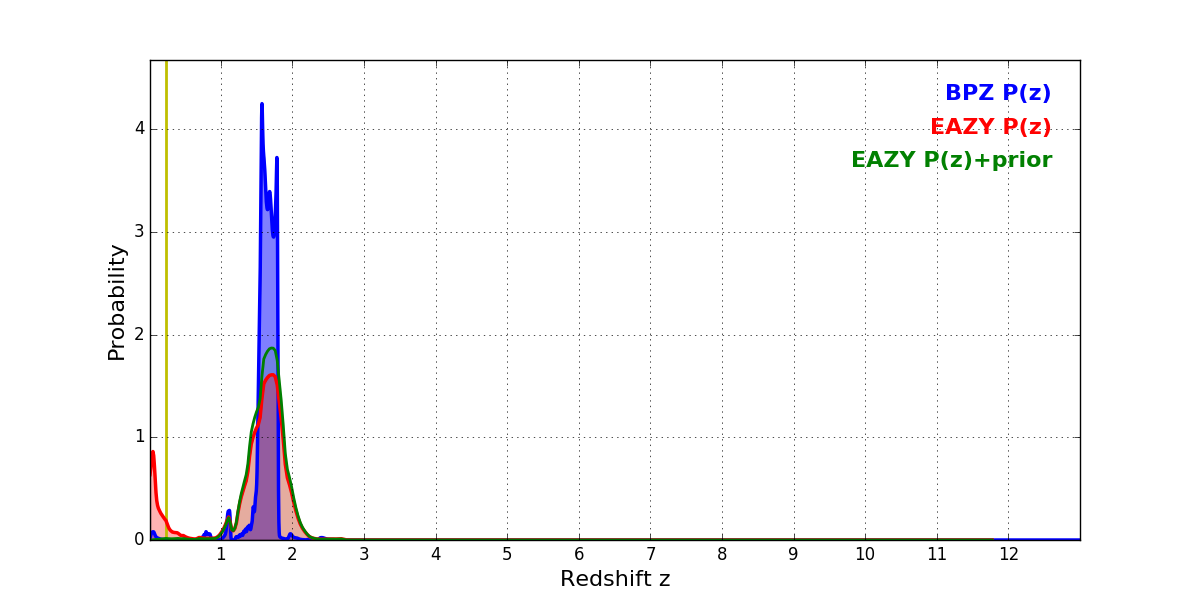 In P(z) plots: Yellow lines mark the cluster redshift z = 0.228,