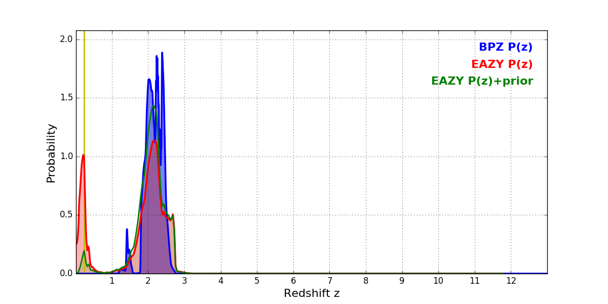 In P(z) plots: Yellow lines mark the cluster redshift z = 0.228,