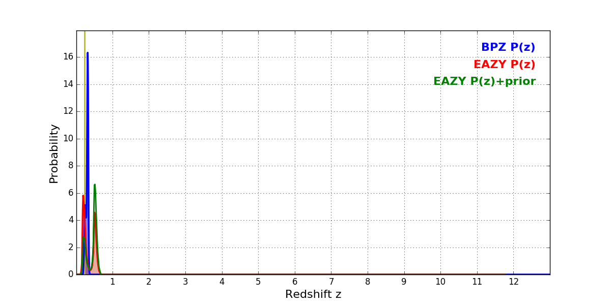 In P(z) plots: Yellow lines mark the cluster redshift z = 0.228,