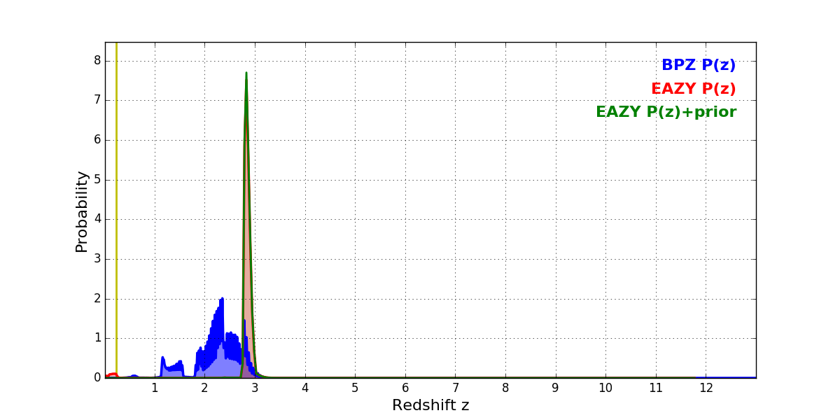 In P(z) plots: Yellow lines mark the cluster redshift z = 0.228,