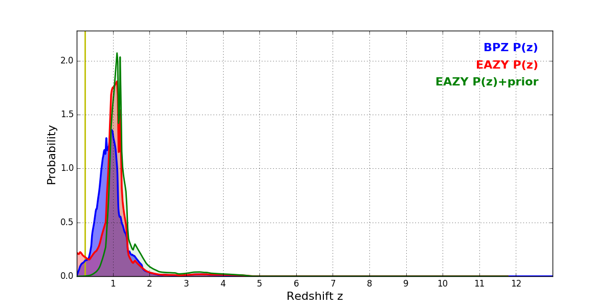 In P(z) plots: Yellow lines mark the cluster redshift z = 0.228,