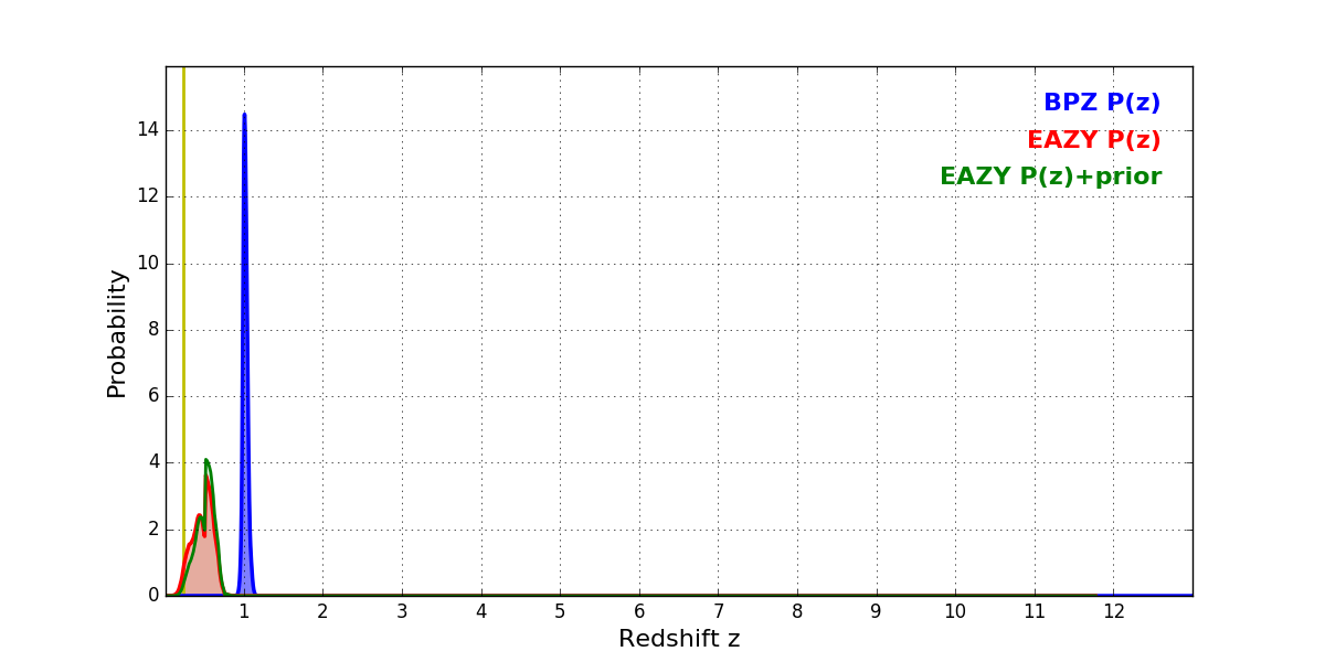 In P(z) plots: Yellow lines mark the cluster redshift z = 0.228,