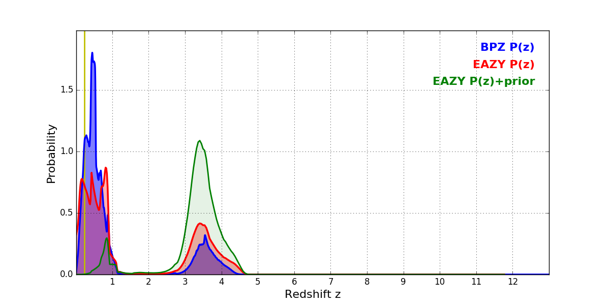 In P(z) plots: Yellow lines mark the cluster redshift z = 0.228,