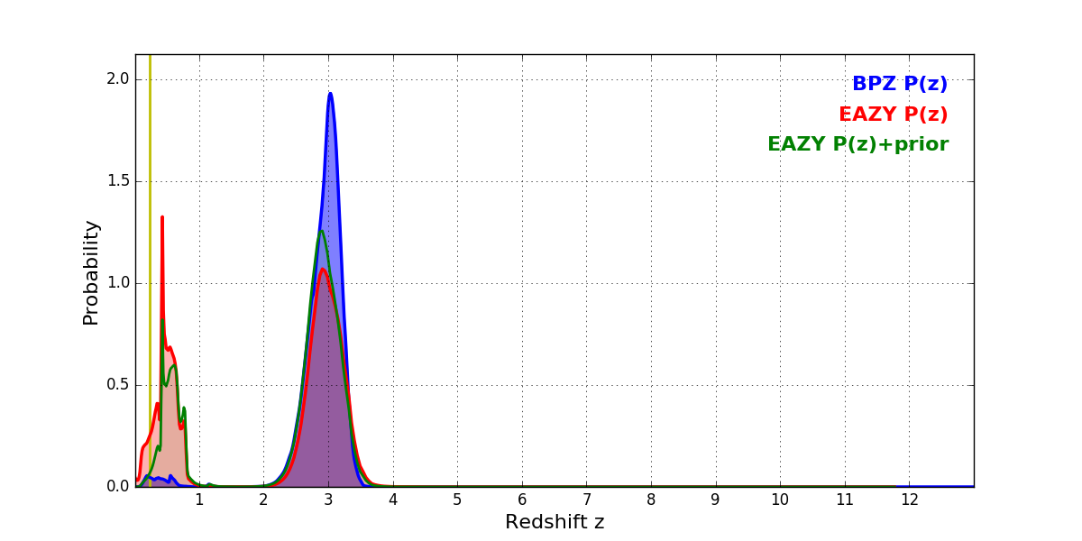 In P(z) plots: Yellow lines mark the cluster redshift z = 0.228,