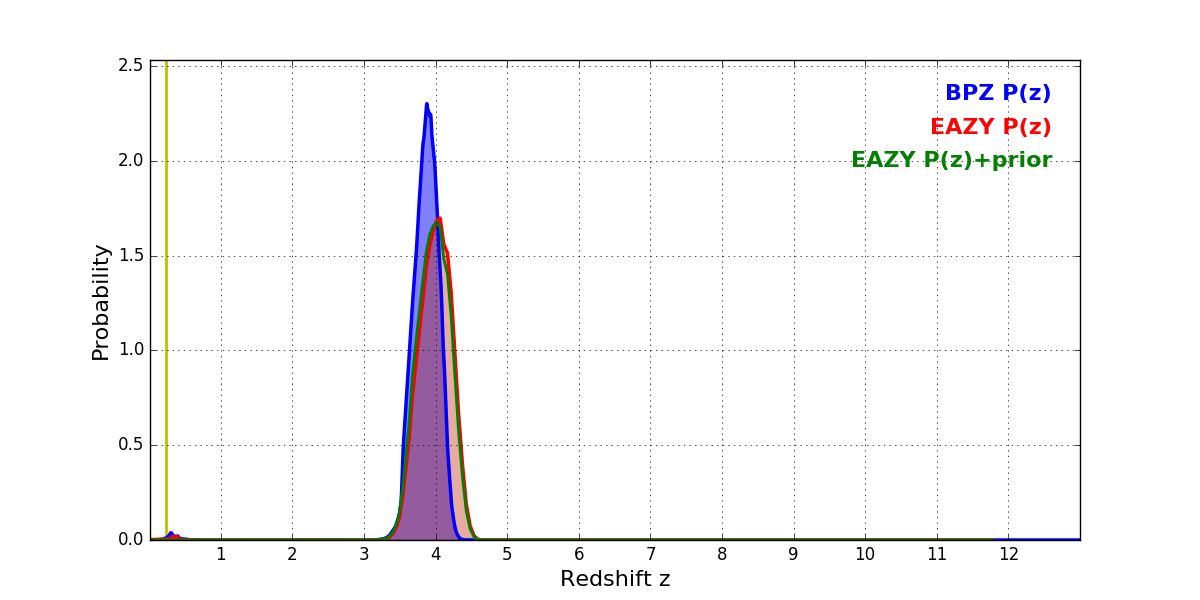 In P(z) plots: Yellow lines mark the cluster redshift z = 0.228,