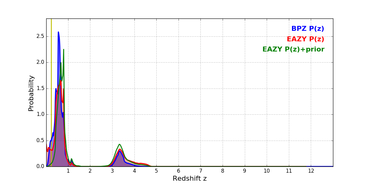 In P(z) plots: Yellow lines mark the cluster redshift z = 0.228,
