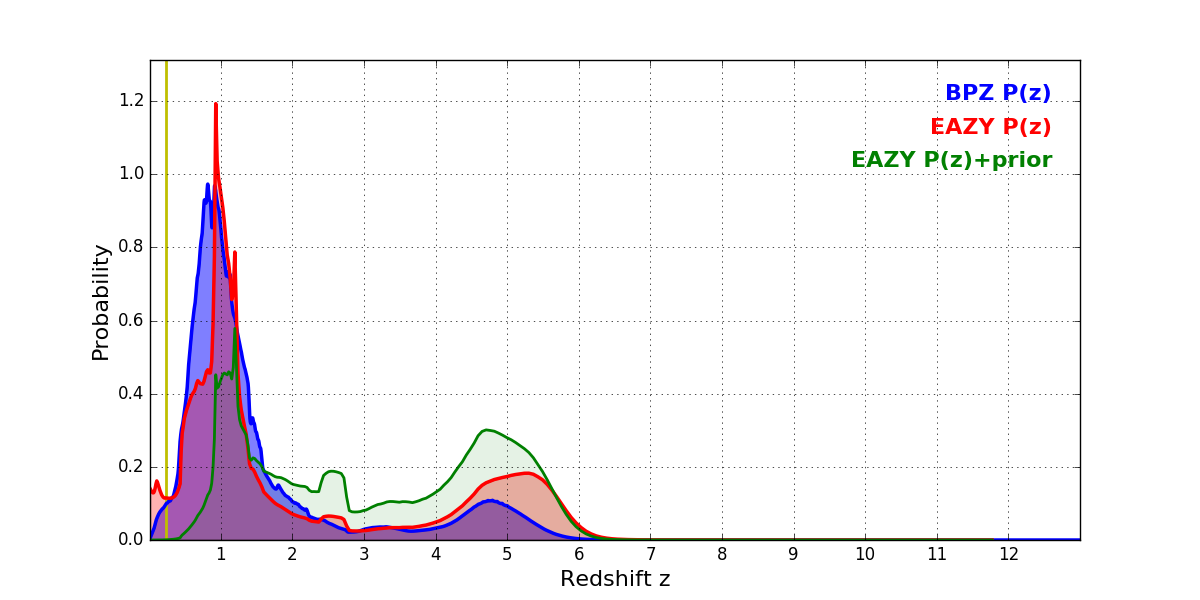 In P(z) plots: Yellow lines mark the cluster redshift z = 0.228,