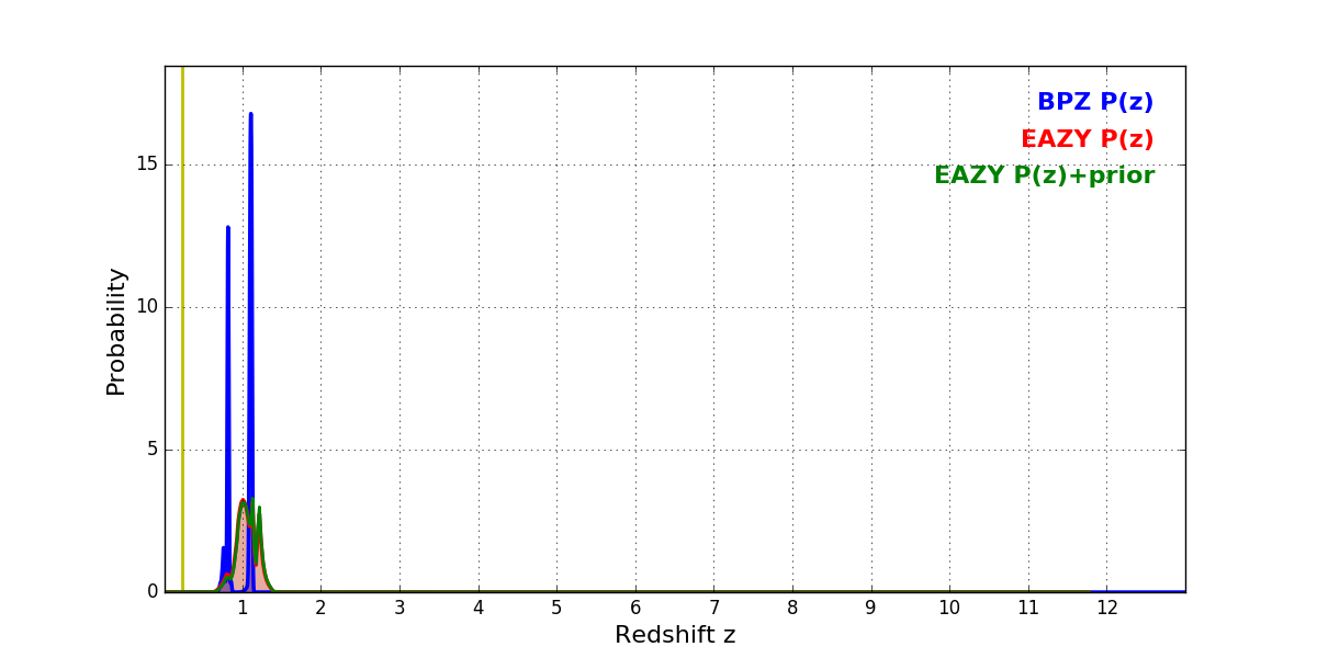In P(z) plots: Yellow lines mark the cluster redshift z = 0.228,