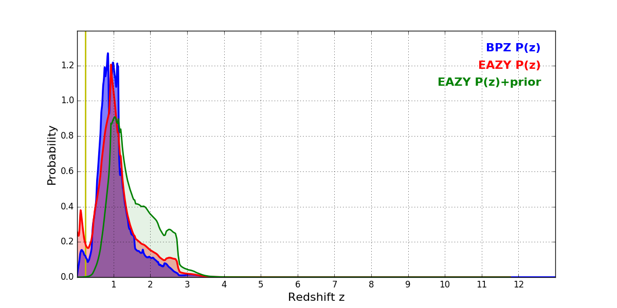 In P(z) plots: Yellow lines mark the cluster redshift z = 0.228,