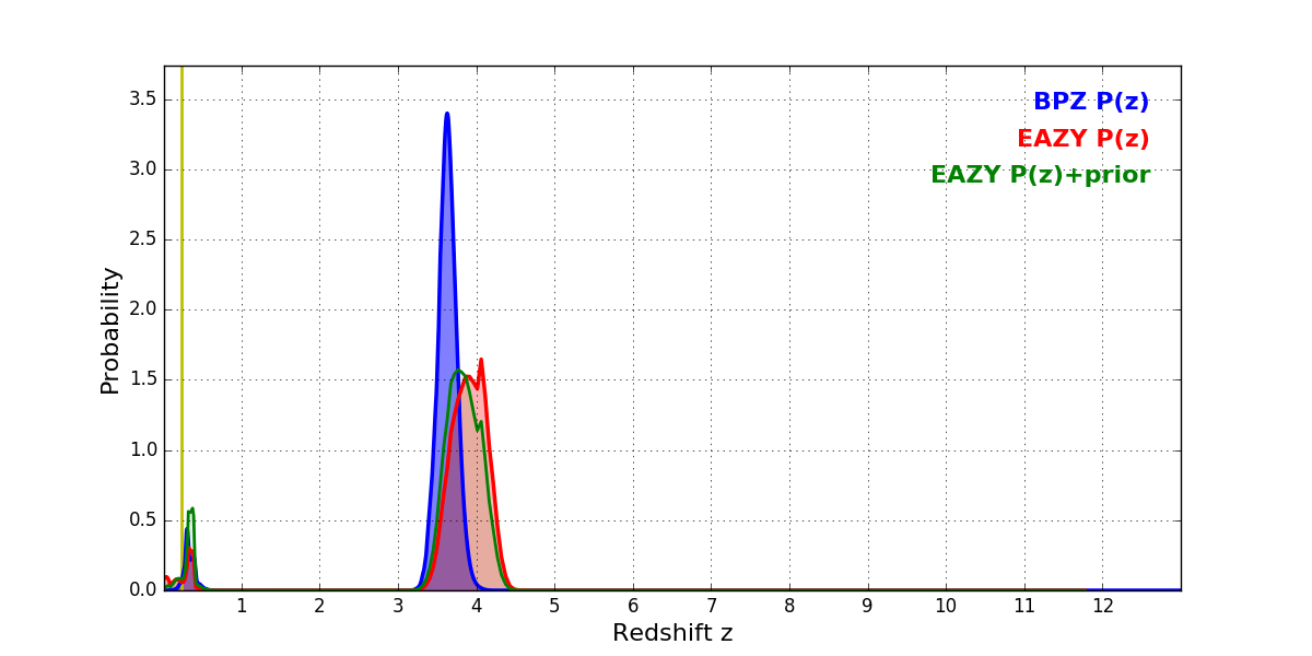 In P(z) plots: Yellow lines mark the cluster redshift z = 0.228,