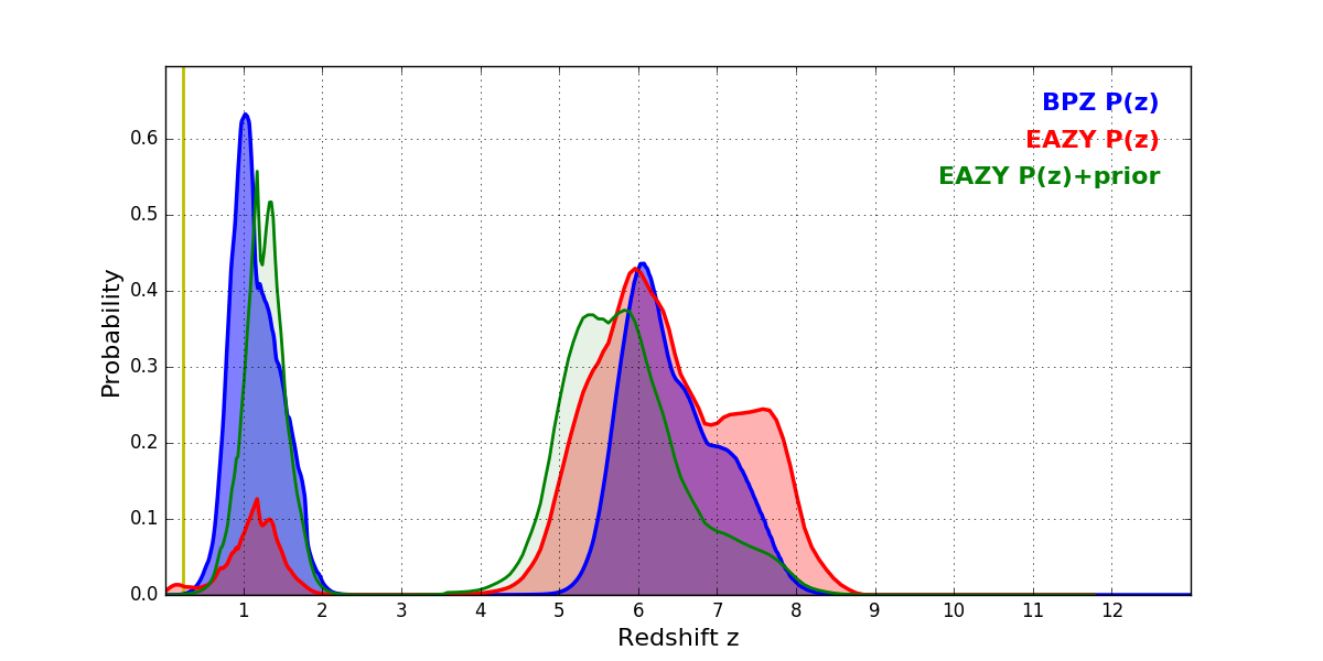 In P(z) plots: Yellow lines mark the cluster redshift z = 0.228,
