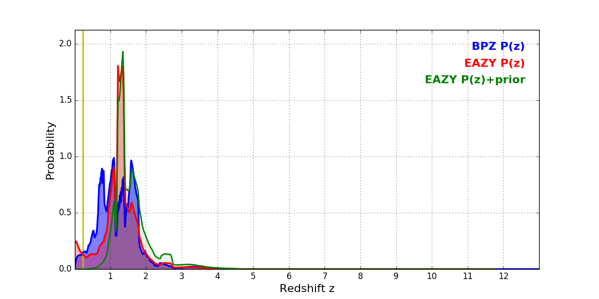 In P(z) plots: Yellow lines mark the cluster redshift z = 0.228,