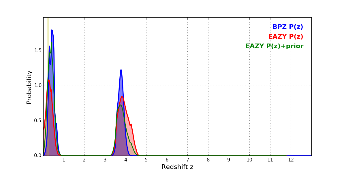 In P(z) plots: Yellow lines mark the cluster redshift z = 0.228,