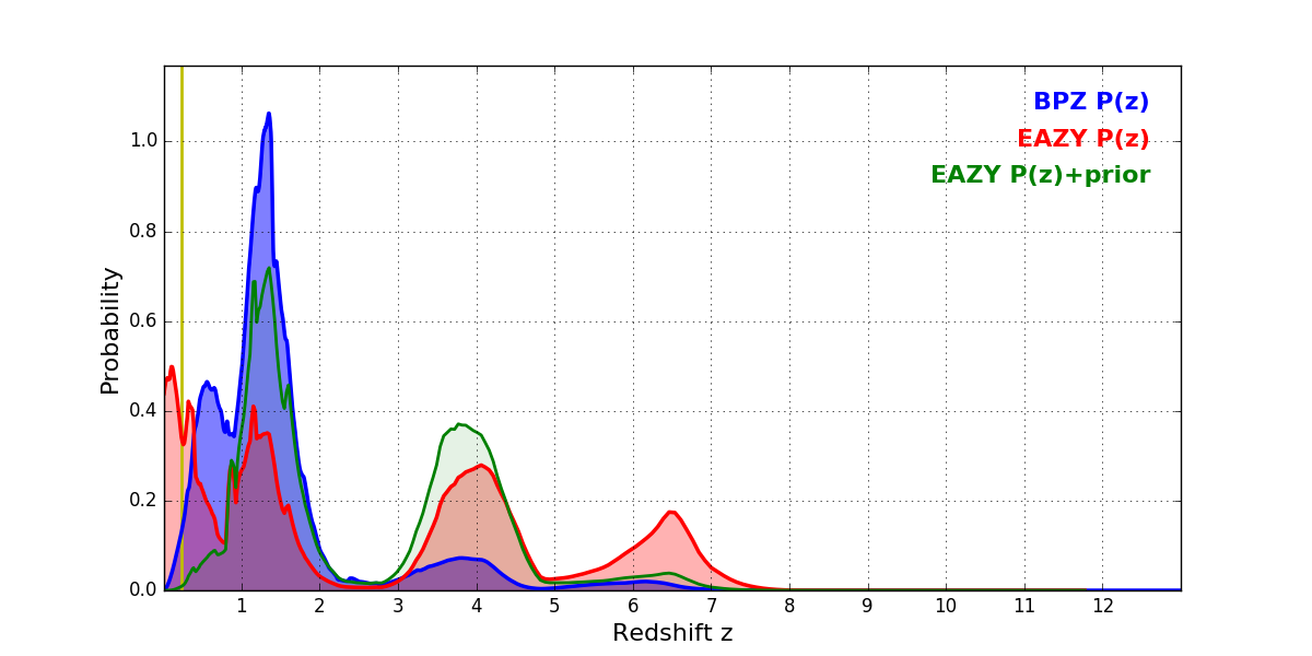 In P(z) plots: Yellow lines mark the cluster redshift z = 0.228,