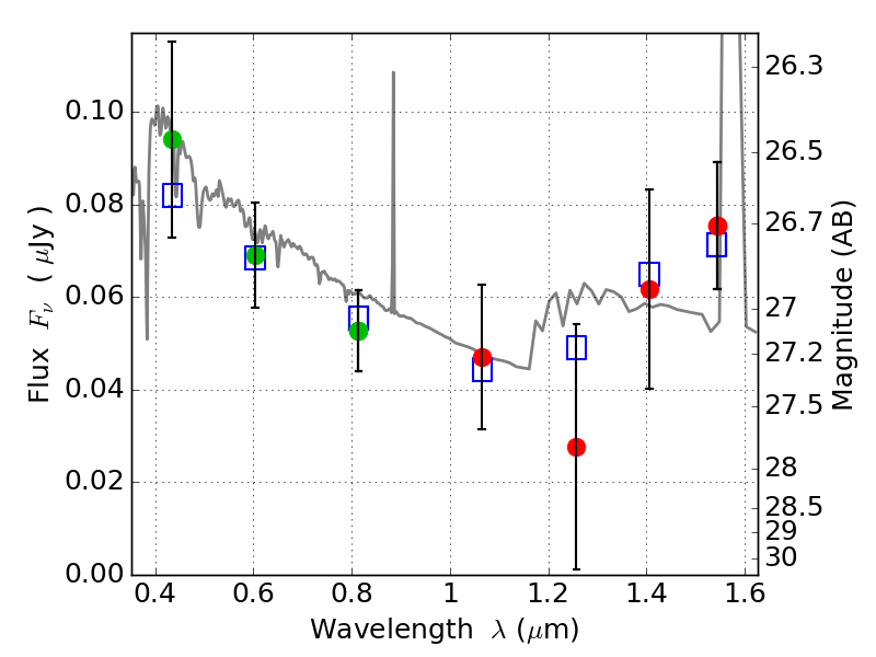 Object #1898   x,y = (2744, 5195)   RA, Dec = (16:15:48.456, -6:07:13.08) = (243.95190, -6.12030)   BPZ = 2.163 [1.229--2.838]   type = 11.00 (SB11_A_0_l)   chisq2 = 0.18   ODDS = 0.33   z_cluster = 0.203