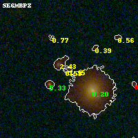 Object #145 x,y = (2013, 5431) RA, Dec = (16:15:51.408, -6:06:59.04) = (243.96420, -6.11640) BPZ = 1.151 [0.133--3.513] type = 10.00 (SB3_B10) chisq2 = 0.19 ODDS = 0.12 z_cluster = 0.203