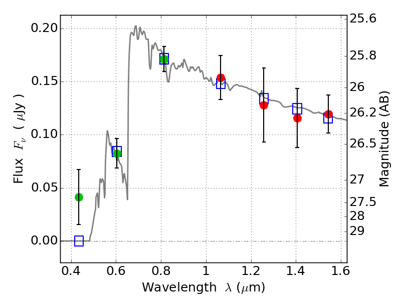 Object #1493 x,y = (2951, 3058) RA, Dec = (16:15:47.616, -6:09:21.24) = (243.94840, -6.15590) BPZ = 4.369 [4.119--4.594] type = 10.70 (SB11_A_0_l - SB3_B10) chisq2 = 0.40 ODDS = 0.93 z_cluster = 0.203