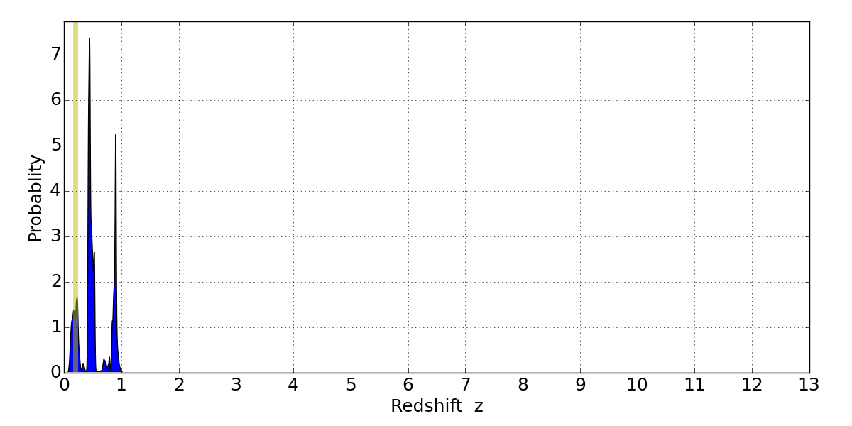 In P(z) plots: Yellow lines mark the cluster redshift z = 0.203,