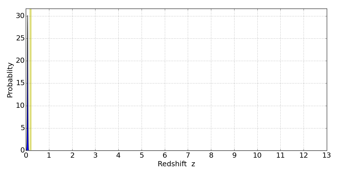 In P(z) plots: Yellow lines mark the cluster redshift z = 0.203,