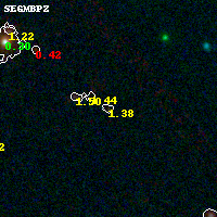 Object #53 x,y = (3189, 5848) RA, Dec = (16:15:46.680, -6:06:33.84) = (243.94450, -6.10940) BPZ = 1.381 [0.171--3.358] type = 9.60 (SB3_B10 - SB2_B10) chisq2 = 0.60 ODDS = 0.19 z_cluster = 0.203