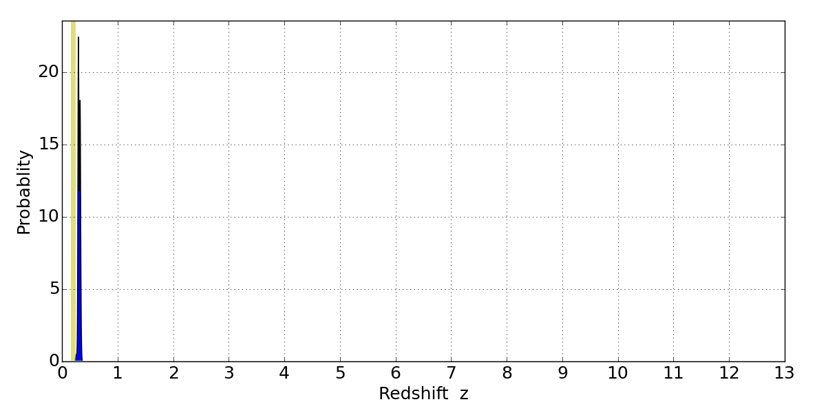 In P(z) plots: Yellow lines mark the cluster redshift z = 0.203,