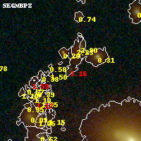 Object #839 x,y = (3560, 4065) RA, Dec = (16:15:45.168, -6:08:20.76) = (243.93820, -6.13910) BPZ = 3.157 [2.155--3.385] type = 7.90 (SB1_B10 - Scd_B10) chisq2 = 1.00 ODDS = 0.45 z_cluster = 0.203
