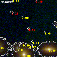 Object #605 x,y = (1490, 2260) RA, Dec = (23:08:25.680, -2:11:43.08) = (347.10700, -2.19530) BPZ = 0.578 [0.140--5.085] type = 8.90 (SB2_B10 - SB1_B10) chisq2 = 1.11 ODDS = 0.09 z_cluster = 0.297