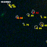 Object #880 x,y = (1457, 1619) RA, Dec = (23:08:25.800, -2:12:21.24) = (347.10750, -2.20590) BPZ = 1.763 [1.013--2.696] type = 11.00 (SB11_A_0_l) chisq2 = 0.65 ODDS = 0.25 z_cluster = 0.297