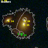 Object #95 x,y = (2601, 3282) RA, Dec = (23:08:21.216, -2:10:41.52) = (347.08840, -2.17820) BPZ = 0.354 [0.277--0.390] type = 3.00 (Ell5_A_0) chisq2 = 0.21 ODDS = 0.88 z_cluster = 0.297