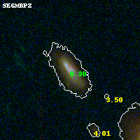Object #968 x,y = (1450, 1381) RA, Dec = (23:08:25.824, -2:12:35.64) = (347.10760, -2.20990) BPZ = 0.299 [0.280--0.340] type = 7.70 (SB1_B10 - Scd_B10) chisq2 = 0.30 ODDS = 0.99 z_cluster = 0.297