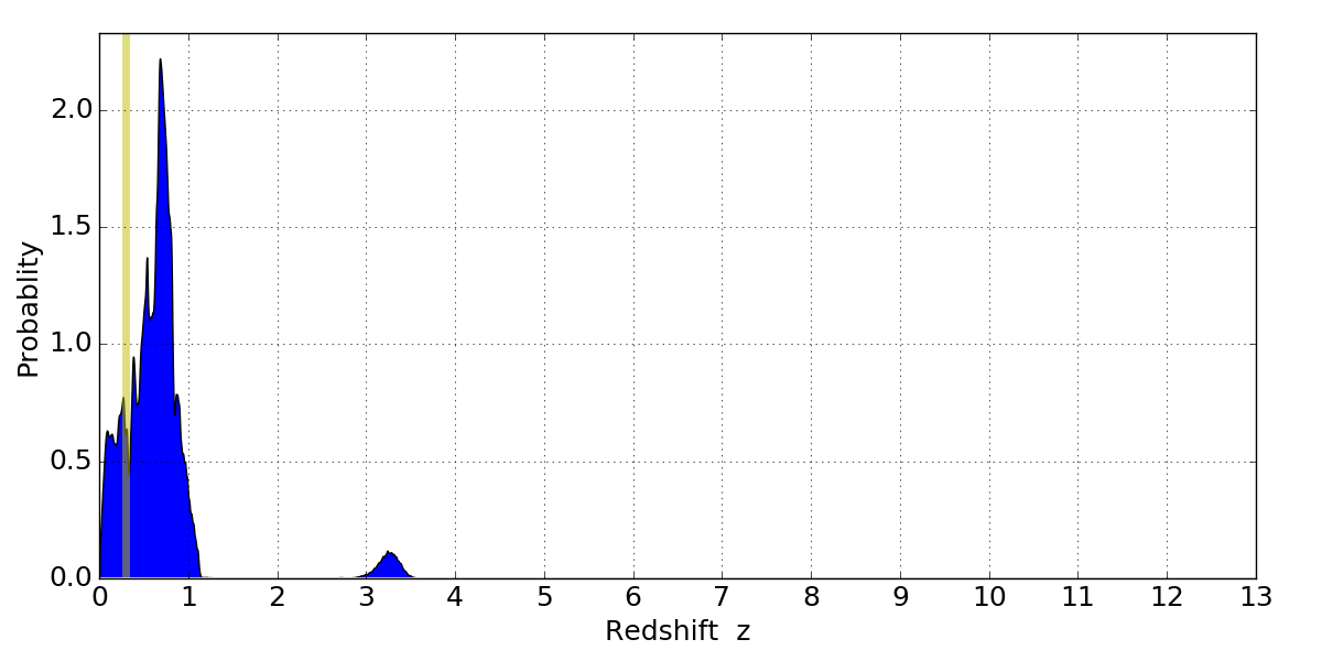 In P(z) plots: Yellow lines mark the cluster redshift z = 0.297,