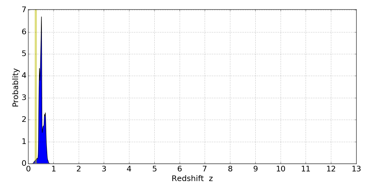 In P(z) plots: Yellow lines mark the cluster redshift z = 0.297,