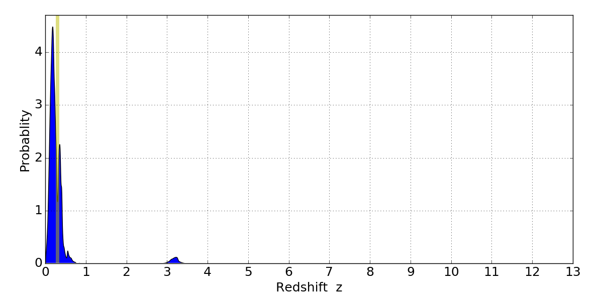 In P(z) plots: Yellow lines mark the cluster redshift z = 0.297,