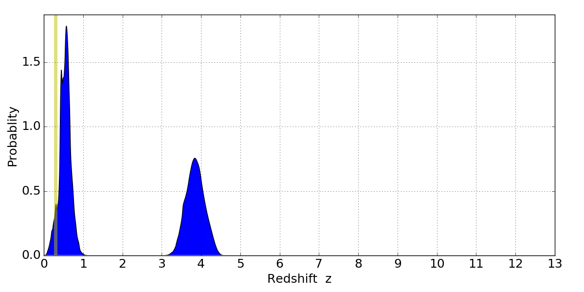 In P(z) plots: Yellow lines mark the cluster redshift z = 0.297,