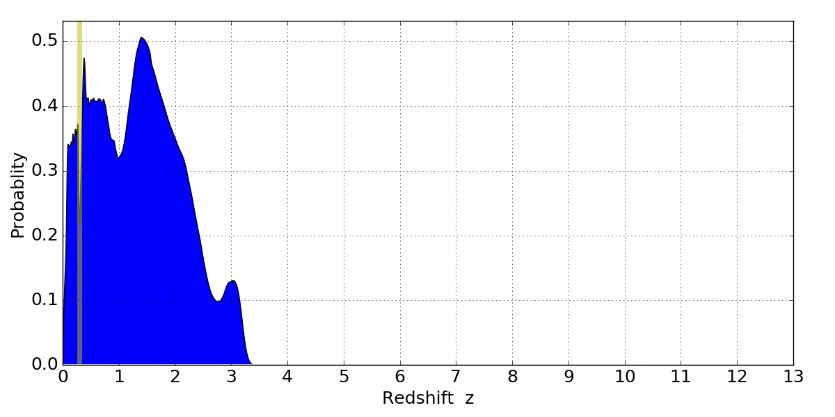In P(z) plots: Yellow lines mark the cluster redshift z = 0.297,