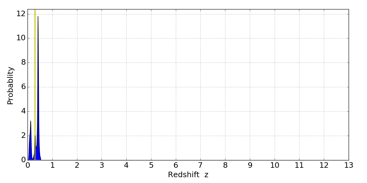 In P(z) plots: Yellow lines mark the cluster redshift z = 0.297,