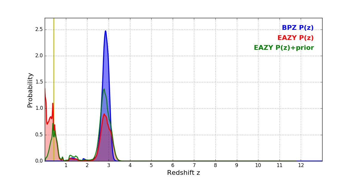 In P(z) plots: Yellow lines mark the cluster redshift z = 0.425,