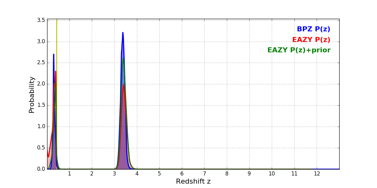 In P(z) plots: Yellow lines mark the cluster redshift z = 0.425,