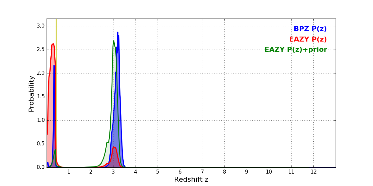In P(z) plots: Yellow lines mark the cluster redshift z = 0.425,