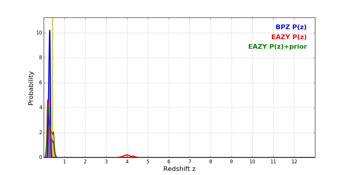 In P(z) plots: Yellow lines mark the cluster redshift z = 0.425,