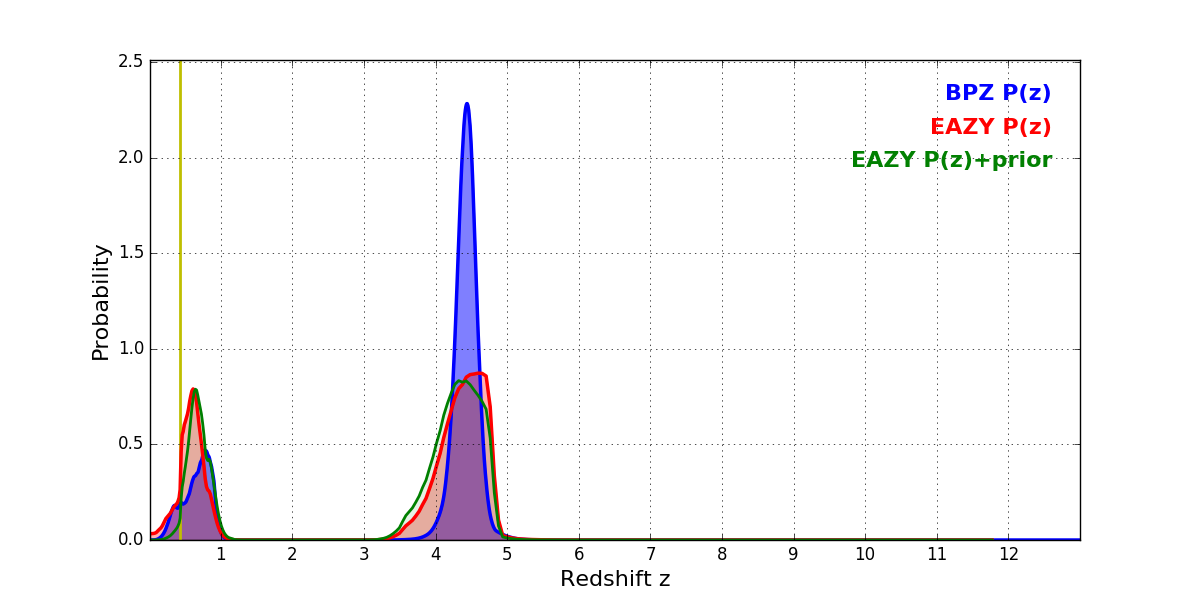 In P(z) plots: Yellow lines mark the cluster redshift z = 0.425,