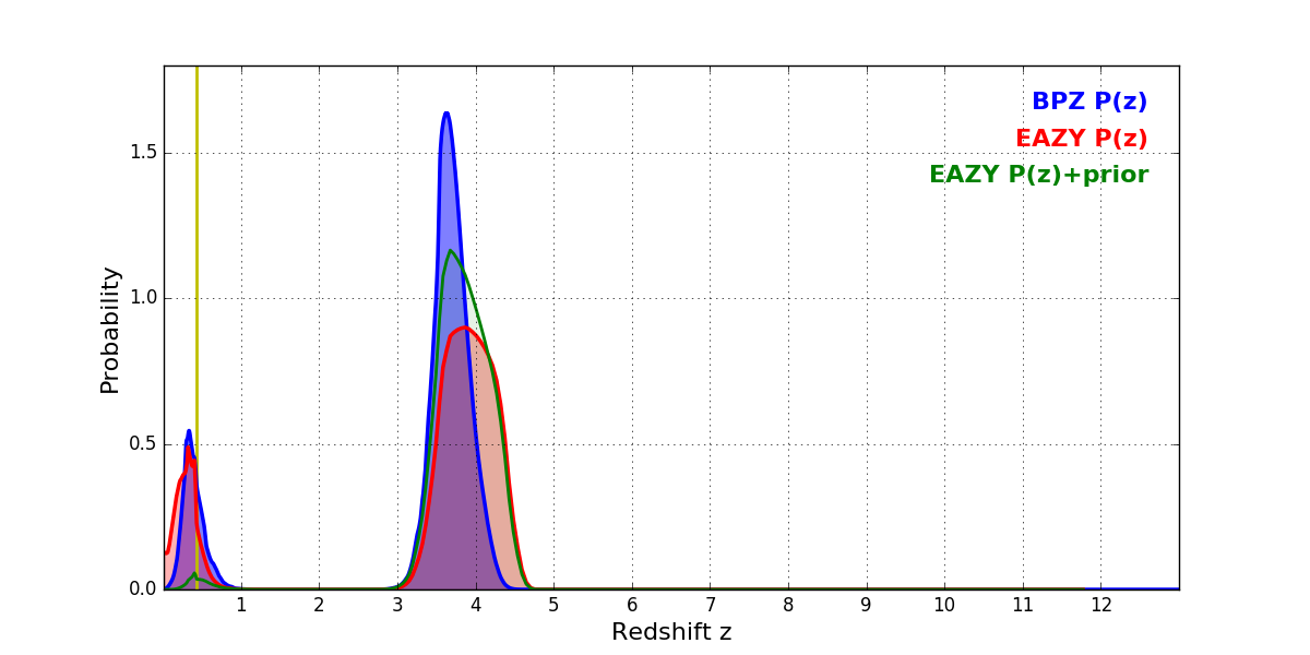 In P(z) plots: Yellow lines mark the cluster redshift z = 0.425,