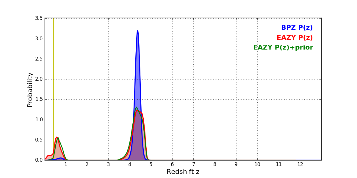 In P(z) plots: Yellow lines mark the cluster redshift z = 0.425,